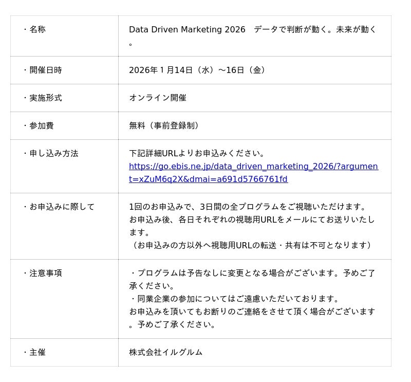 株式会社TWOSTONE&Sonsのグループ会社である株式会社Digital Arrow Partners(所在地:東京都渋谷区、代表取締役CEO:佐藤雅樹、以下 Digital Arrow Partners)は、2026年1月14日(水)~1月16日(金)に株式会社イルグルム(本社:大阪府大阪市北区、代表取締役:岩田進、以下 イルグルム)が開催するオンラインカンファレンスに登壇することをお知らせいたします。