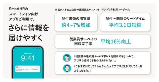 スマートフォン向けアプリを利用しているお客様の一部を対象に行なった調査では、配付書類の閲覧率が約4~7%向上し、配付から閲覧までの平均日数が3.1日短縮、従業員サーベイの回答完了率が平均16%向上するなど着実な業務効率化につながっています。