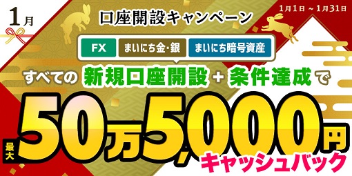 株式会社 マネーパートナーズ(代表取締役社長:福島秀治、本社:東京都港区、以下「当社」)は、2023年1月の新規口座開設者向けキャンペーンとして、『FX(外国為替証拠金取引)、まいにち金・銀(商品CFD取引)、まいにち暗号資産(暗号資産CFD取引)』新規口座開設と条件達成で最大505,000円をキャッシュバックするキャンペーンを実施いたしております。