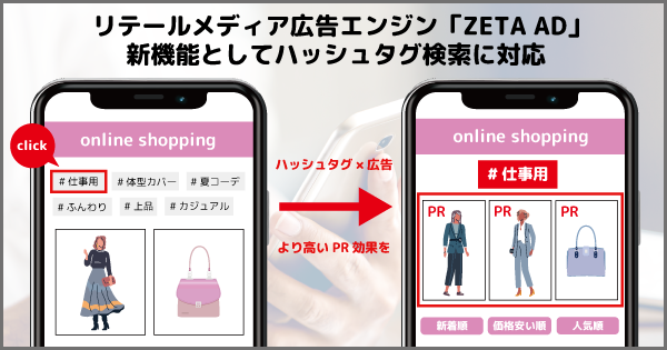 EC商品検索・レビュー・ハッシュタグ・OMOソリューションを開発販売するコマースとCXのリーディングカンパニーであるZETA株式会社(本社:東京都世田谷区、以下ZETA)は、リテールメディア広告エンジン「ZETA AD」の新たなメニューとしてハッシュタグ連動広告機能をリリースしたことをお知らせいたします。