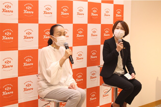 また、今回の発表会では、ファーメンステーション代表取締役 酒井 里奈さんにもご登壇いただき、ウエットティッシュの開発に至るまでの秘話などトークセッションを実施しました。今回の協業について、酒井さんは「ファーメンステーションのパーパスは『発酵で楽しい社会を!』ですが、サーキュラーエコノミーも楽しさを根底に置き、考えを一緒に広めていきたい」とお話しいただきました。また、今後の商品展開についても、「カンロ飴からつくったエタノールだけではなくて、エタノール製造時に出る発酵粕も機能性があるので、これも活用した製品も届けるなど、全ての資源を活用していきたい」と意気込みを語っていただきました。