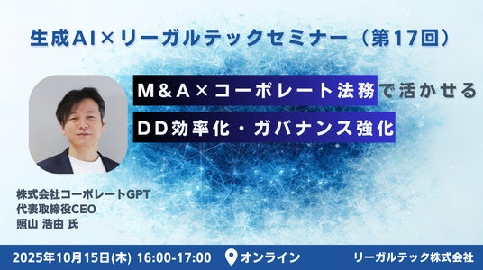 本セミナーでは、SHIFT時代に多数のM&Aに携わり、現在はコーポレート部門に特化したAIコンサルティングを展開する 株式会社コーポレートGPT 代表取締役 照山浩由氏 をお迎えし、M&A実務とコーポレート法務における最新の課題と解決策を具体的に解説します。