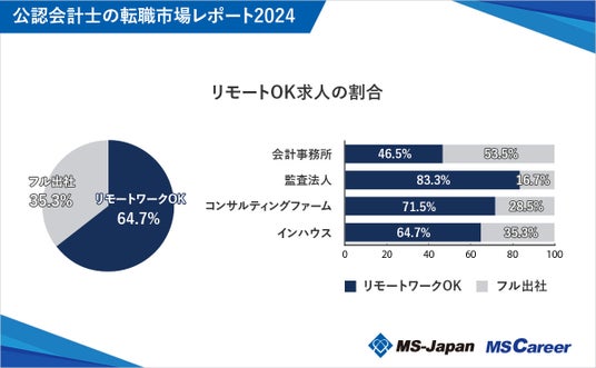 会計士募集求人は、「65%」がリモートOKであることが明らかに。業界別でみると、監査法人の求人が最も高く、全体の83%がリモートOK、一般企業の求人は65%がOK、会計事務所の求人が最も低く、47%と半数を切る状況であることがわかりました。