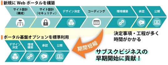 サブスクビジネスの開始時には、顧客管理、契約、課金・請求、決済まで一連の管理業務の環境だけでなく、契約者向けの充実したサービス利用環境の準備が必要です。特に、契約申し込み用のWebページ、契約情報の確認や変更ができるWebページを備えた契約者向けのWebポータルは必須となる一方で、その構築には、サイバー攻撃の対象にもなりやすい個人情報や契約情報を取り扱うため、十分なセキュリティ対策も必要で、時間を要します。