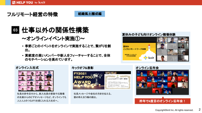 ニットでは、フルリモートで事業運営してきたノウハウを活かし、オンラインイベントを多数実施してきました。夏休みには、子ども向けオンライン職場体験、年末には昨年で4度目のオンライン忘年会を開催しました。社内向け・社外向け問わず様々なニーズに合わせて、季節ごとのイベントをオンラインで実施しています。リアルで会えなくても、人と人との温かいつながりを創出しています。