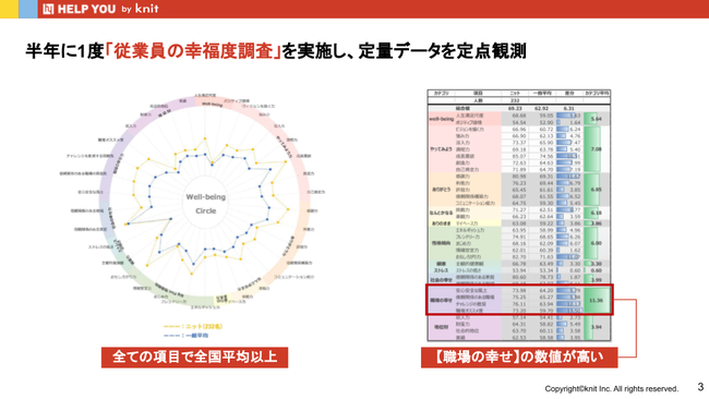 ニットでは半年に1度、従業員の幸福度調査を実施しています。全ての項目で全国平均以上となり、特に「職場の幸せ」の項目での数値が高いという結果になりました。フルリモートでありながら、一人ひとりが仕事へのやりがいを感じ、自分らしく働けている結果と言えます。