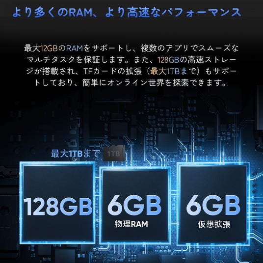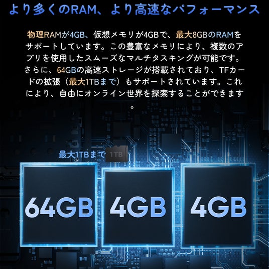 大容量メモリとストレージ:8GBのRAMメモリ(4GB内蔵 + 4GB拡張)と64GBの内部ROMメモリに加え、最大1TBまでのTFカードサポート。さまざまなアプリの利用や大容量データの管理に対応します。