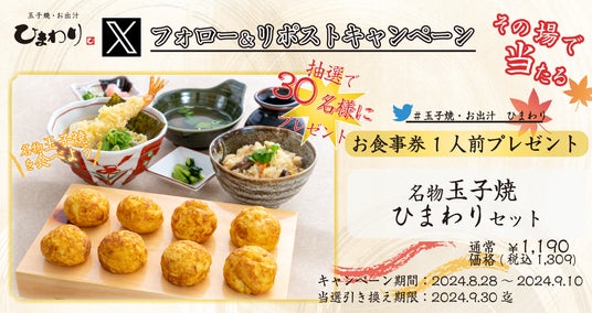 この度、玉子焼・お出汁ひまわり公式Xアカウントをフォロー&リポストして応募すると、抽選で30名様に「名物玉子焼 ひまわりセット1人前(税込み1,309円)」をお召し上がりいただけるデジタルお食事券プレゼントキャンペーンを、2024年8月28日(水)より開催します。この機会にぜひご応募ください。