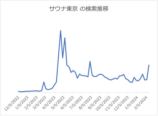 検索者数ランキングでも1位に輝いた「サウナ東京」は、2023年3月ごろから検索され始め、今も注目を集め続けることから今後も継続的な人気が期待できる結果となりました。テーマの異なる5つのサウナや温度別の水風呂などの本格的な設備が話題で、「予約」「混雑」などのワードも共によく検索されており、注目が高まっていることがわかります。男性専用施設である点もポイントで、サウナ愛好家からの人気が高そうです。