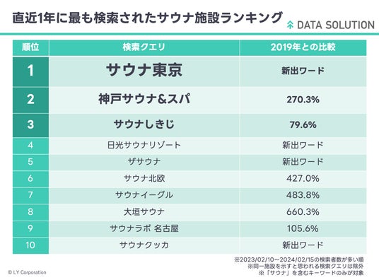 LINEヤフー株式会社(以下、LINEヤフー)が提供する、LINEヤフーの多様なサービスから得られる行動ビッグデータを分析できる事業者向けサービス「ヤフー・データソリューション」は、3月7日の「サウナの日」にちなみ、サウナにまつわるさまざまな検索動向を分析したレポート「浸透するサウナ文化。検索ビッグデータから見える過去からの変化とトレンド」を公開しました。