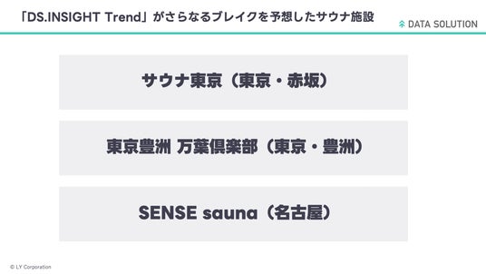 「DS.INSIGHT」の急上昇トピックやトレンドをAIが可視化する「DS.INSIGHT Trend」機能を使用し、検索数の伸びから今後のブレイクが期待できるサウナ施設をピックアップしました。