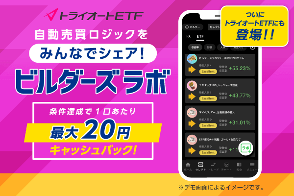 キャンペーン期間中にビルダーズラボ(ETF)の自動売買プログラムを利用で、1口あたり最大20円をキャッシュバックいたします!!