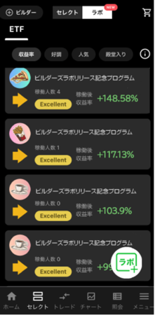 自分の投資スタイルに合わせて選ぶだけの自動売買セレクトや、好みの銘柄を選んで自分で自動売買を作ることができるビルダー機能など、初めて投資をされる方はもちろん、投資経験者の方にもETFに投資いただきやすいサービスです。