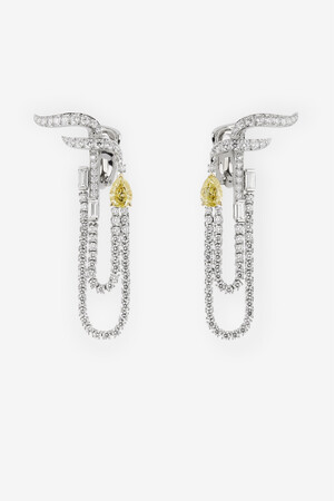 「ジョイエッロ ジャッロ」チャプターの傑作は、パーフェクトサークルにアシンメトリーのディテールがあしらわれたダイヤモンドネックレスです。「バゲット」カットと、ブリリアントカットダイヤモンドの2つのスレッドに先端にはペアシェイプのファンシーインテンスイエローダイヤモンドがあしらわれたダイヤモンドチェーンが吊り下げられ、左側には「FF」ロゴモチーフが付いています。流線型の2本のストランドに「FF」ロゴモチーフがあしらわれたお揃いのイヤリングが同じエフェクトをもたらし、ドレープブローチがさらにその効果を高めます。「バゲット」カットとラウンドダイヤモンドが用いられた魅力的なダブルテニスブレスレットには、控えめな「FF」ロゴモチーフが繰り返しあしらわれています。