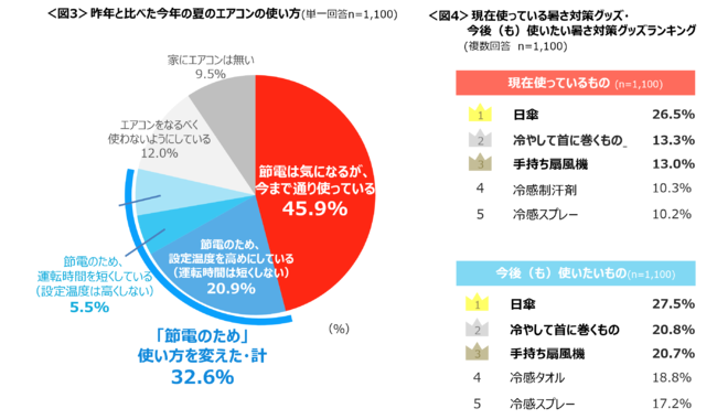 昨年と比べた今夏のエアコンの使い方は「節電は気になるが、今まで通り使っている」が45.9%と半数近くを占める。「節電のため」昨年と比べて使い方を変えた人は32.6%。<図3>