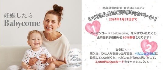 人形の喜峯は、ひな祭りを楽しくお祝いしていただける家庭を全国に広げるために、妊娠・育児コミュニティを25年間運営するベビカム株式会社(本社所在地:東京都千代田区、代表取締役:安西正育)と、2023年末から、コラボレーションをスタートしています。