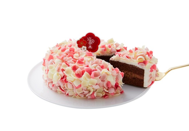 チョコレートスポンジで、ウォールナッツ入りのチョコレートクリームをサンドしました。赤、ピンク、ホワイトのチョコレートコポで仕立てた、新たな年の訪れを祝う、華やかなチョコレートケーキです。