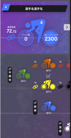 ・「並び予想」を画像で見ることができるため、一目でレースの展開が分かります。「ライングラフィック」上では、自転車の前輪にバック数(最終周回のバック・ストレッチ・ラインに先頭で到達した回数)、後輪に「Kレーティング」を記載。さらに同じラインの前の選手にどれだけついていけるかを表した連携強度も新たに記載しました。選手の強さの分析やレース展開の予想に役立てることができます。