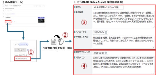 テクノロジーと創造力で、企業のDXを加速する株式会社テンダ(本社/東京都渋谷区、代表取締役会長兼社長CEO/薗部 晃、以下「テンダ」)は、AI技術に強みを持ち、多数のAIシステム構築実績を有するグループ会社である株式会社Almondo(本社/東京都渋谷区、代表取締役社長/伊藤 滉太、以下「Almondo」)と協業し、商談内容の自動記録やデータ登録、次に取るべきアクションの提示を通じて営業活動を支援するアプリケーション『TRAN-DX Sales Assist』において、PoC(概念実証)を完了しました。本PoCでは、商談内容をもとに、SFA(営業支援システム)への自動登録や、商談情報の標準化・蓄積が可能であることを確認しています。