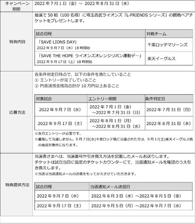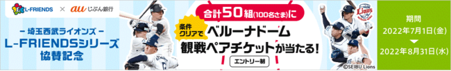 また、本協賛を記念して2022年7月1日から2022年8月31日まで、「合計50組(100名様)に当たる!L-FRIENDSシリーズ協賛記念!チケットプレゼントキャンペーン」(以下 本キャンペーン)を実施します。本キャンペーンでは、auじぶん銀行口座をお持ちのお客さまのうち、円普通預金残高10万円以上かつキャンペーンにエントリーいただいたお客さまの中から抽選で合計50組(100名様)に、ベルーナドームで開催される『L-FRIENDSシリーズ』の「SAVE LIONS DAY」「SAVE THE HOPE ライオンズオレンジリボン運動デー」の観戦ペアチケットをプレゼントします。