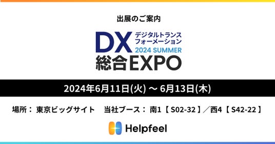 株式会社Helpfeel(京都府京都市、代表取締役/CEO:洛西 一周、以下「当社」)は、2024年6月11日(火)~6月13日(木)に東京ビッグサイトで開催される展示会「DX 総合EXPO 2024 夏 東京」に出展することをお知らせいたします。