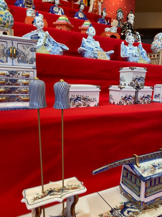 有田の窯元・しん窯で、3年がかりで制作された七段飾りで、高さはなんと2.7m。人形、ぼんぼり、お道具など全て有田焼で作られています。細部にわたって丁寧に描かれている文様や、人形一体一体の表情の違いにもご注目ください。