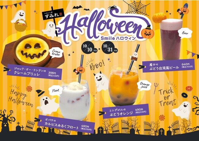 株式会社すみれ(所在地:東京都渋谷区/代表取締役:湯澤忠則)が運営する「やきとり家すみれ」は子供もから大人まで楽しめる「smileハロウィンキャンペーン」を2023年10月10日(火)から10月31日(火)まで、全店舗にて開催します。「ジャック・オー・ランタンのクレームブリュレ」や「オバケのカルピスみるくフロート」などのハロウィン限定のスイーツ&ドリンクを提供の他、小学生以下のお子様には「トリック・オア・トリート」の合言葉でお菓子をプレゼントします。