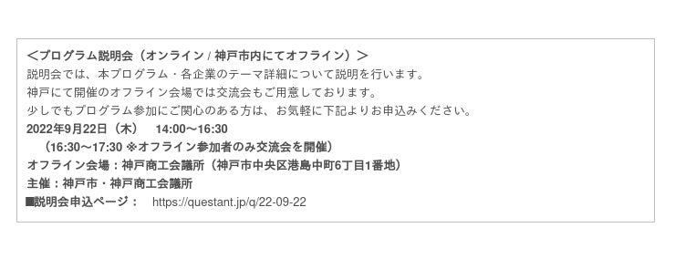 神戸市内企業10社が参画。新たな事業開発や課題解決に向けたテーマをともにチャレンジしたい共創パートナーを募集。募集期間:2022年9月8日(木)~10月13日(木)