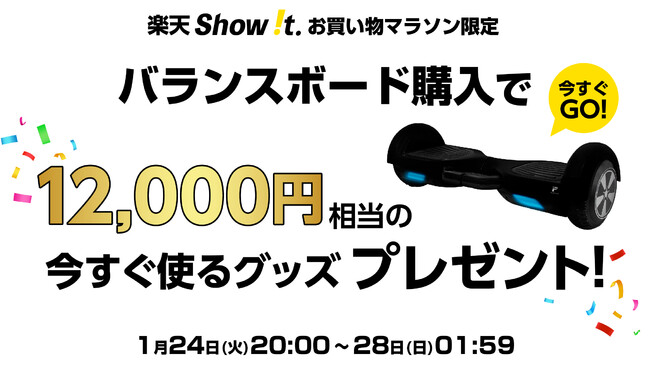 楽天市場「Show !t」は1月24日(火)20:00~1月28日(土)01:59まで電動キックボードご購入で12,000円相当の収納バッグとキッズプロテクターもしくはヘルメット、さらに防水バッグをプレゼント。お得なMEISTER.F電動バランスボードセットを販売します。さらに、ポイント10倍プレゼント(一部商品を除く)・送料無料の楽天お買い物マラソンに参加します。届いたらすぐにバランスボードに乗る練習ができるアイテムが一回で揃えられるこの機会にお得に一式そろえて、アウトドアを楽しみましょう。