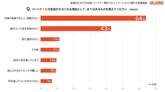 「パートナーとの会話が少なくなる理由」について尋ねたところ、最も高かったのは「仕事や家事で忙しく、時間がない」が64%にのぼり、日々の生活に追われる中で、会話のための時間が確保しにくい現状が浮き彫りになりました。