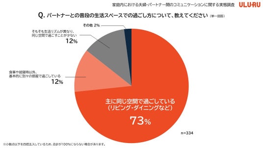 「パートナーとの普段の生活スペースにおける過ごし方」について尋ねたところ、最も高かったのは「主に同じ空間で過ごしている(リビング・ダイニングなど)」で、73%という結果になりました。多くの家庭で、日常的に同じ空間を共有するスタイルが主流であることがわかります。