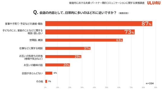労働力不足問題解決のリーディングカンパニーとして、複数のSaaSを展開する株式会社うるる(東京都中央区 代表取締役社長:星 知也、以下「うるる」)は、家族と過ごす時間が増える夏休みシーズンを前に、家庭内のコミュニケーションに着目し、18歳未満の子どもを持つ20代~50代の女性334名を対象に、家庭内における夫婦・パートナー間のコミュニケーションの実態について調査を実施いたしました。