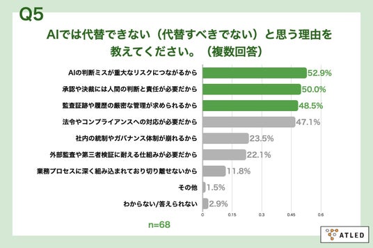 「Q5. Q4で「非常にそう思う」「ややそう思う」と回答した方にお聞きします。AIでは代替できない(代替すべきでない)と思う理由を教えてください。(複数回答)」(n=68)と質問したところ、「AIの判断ミスが重大なリスクにつながるから」が52.9%、「承認や決裁には人間の判断と責任が必要だから」が50.0%、「監査証跡や履歴の厳密な管理が求められるから」が48.5%という回答となりました。