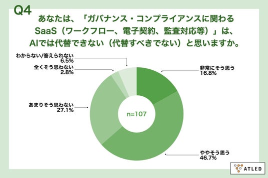 「Q4. あなたは、「ガバナンス・コンプライアンスに関わるSaaS(ワークフロー、電子契約、監査対応等)」は、AIでは代替できない(代替すべきでない)と思いますか。」(n=107)と質問したところ、「非常にそう思う」が16.8%、「ややそう思う」が46.7%という回答となりました。
