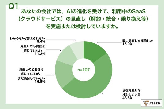「Q1. あなたの会社では、AIの進化を受けて、利用中のSaaS(クラウドサービス)の見直し(解約・統合・乗り換え等)を実施または検討していますか。」(n=107)と質問したところ、「既に見直しを実施した」が15.0%、「現在見直しを検討している」が48.6%という回答となりました。