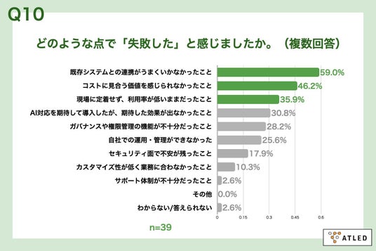 「Q10. Q9で「はい」と回答した方にお聞きします。どのような点で「失敗した」と感じましたか。(複数回答)」(n=39)と質問したところ、「既存システムとの連携がうまくいかなかったこと」が59.0%、「コストに見合う価値を感じられなかったこと」が46.2%、「現場に定着せず、利用率が低いままだったこと」が35.9%という回答となりました。