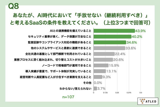 「Q8. あなたが、AI時代において「手放せない(継続利用すべき)」と考えるSaaSの条件を教えてください。(上位3つまで回答可)」(n=107)と質問したところ、「AIとの連携機能を備えていること」が43.9%、「セキュリティ基準が高く、データ保護が万全なこと」が40.2%、「監査証跡やコンプライアンス対応の機能があること」が34.6%という回答となりました。