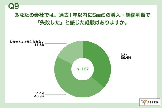 「Q9. あなたの会社では、過去1年以内にSaaSの導入・継続判断で「失敗した」と感じた経験はありますか。」(n=107)と質問したところ、「はい」が36.4%、「いいえ」が45.8%という回答となりました。