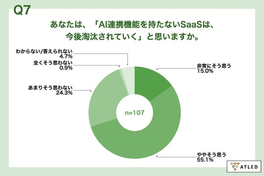 「Q7. あなたは、「AI連携機能を持たないSaaSは、今後淘汰されていく」と思いますか。」(n=107)と質問したところ、「非常にそう思う」が15.0%、「ややそう思う」が55.1%という回答となりました。