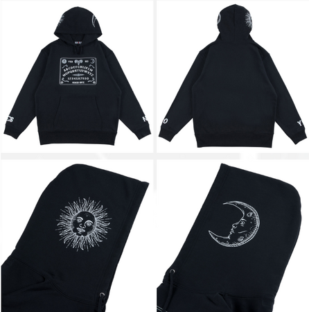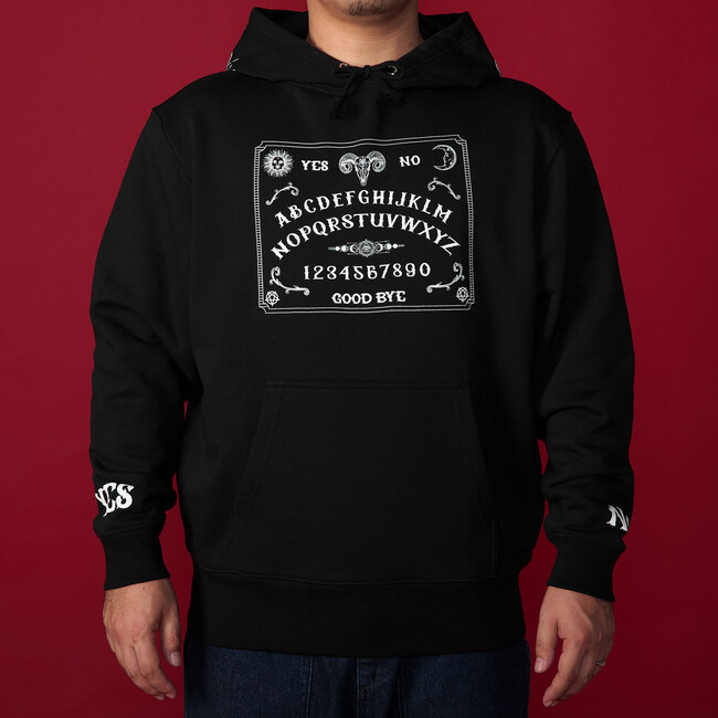 大人気ウィジャボードデザインがTシャツに続きパーカーが新登場。フードや袖にもプリントされたインパクト大なデザインはこの冬最強のオカルティックアパレル。オカルト好きなあなたへ。