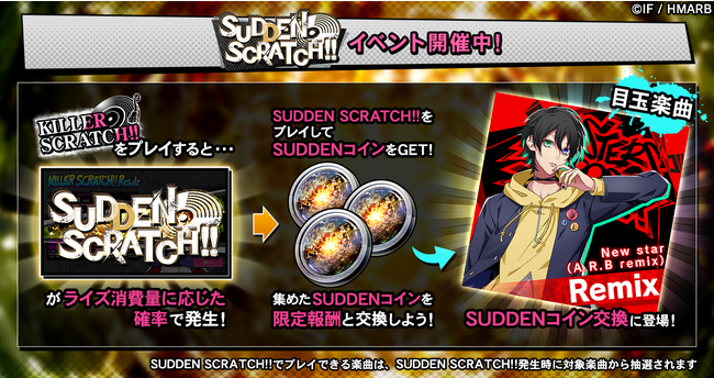 イベント期間中、KILLER SCRATCH!!をプレイするとライズ消費量に応じた確率でSUDDEN SCRATCH!!が発生します。SUDDEN SCRATCH!!をプレイすると、通常の報酬アイテムの他、限定アイテム「SUDDENコイン」を獲得することができます。「SUDDENコイン」を集めることで、新楽曲「New star(A.R.B remix)」と交換することが可能です。詳細はアプリ内お知らせをご確認ください。