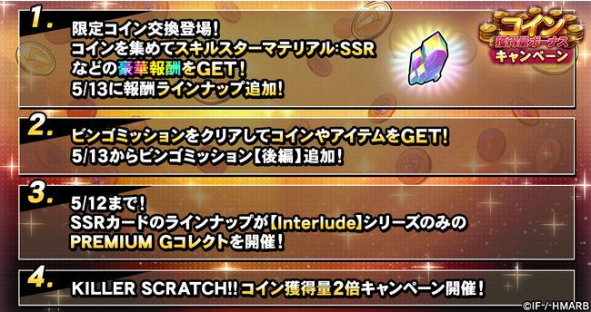 「スキルスターマテリアル:SSR」など豪華アイテムと交換できる限定コイン交換をはじめ、ビンゴミッションやログインボーナス、KILLER SCRATCH!!をプレイした際のコイン獲得量が2倍になるキャンペーンなどを開催しています。詳細はアプリ内お知らせをご確認ください。