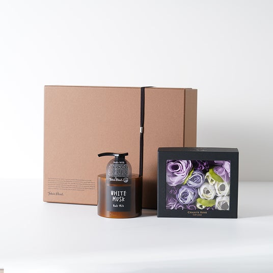 (中央)シャリテローズ フラワーバスペタル John's Blend ボディミルク ギフトボックスセット/¥5,610(税込)