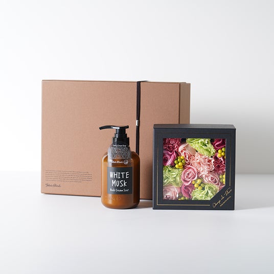 (右)シャン・ド・フルール ボックスバスペタル × John's Blend ボディクリームソープ ギフトボックスセット/¥6,710(税込)