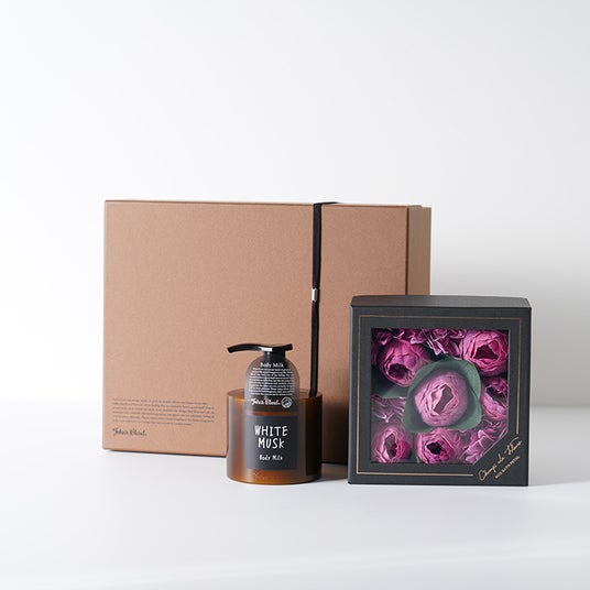 (中央)シャン・ド・フルール ボックスバスペタル × John's Blend ボディミルク ギフトボックスセット/¥7,480(税込)