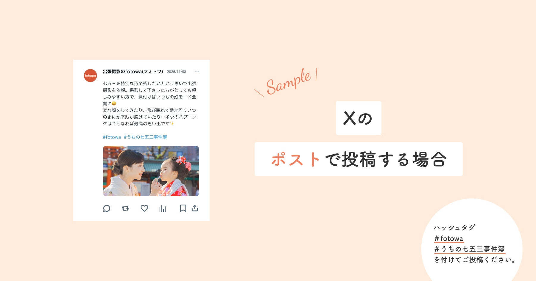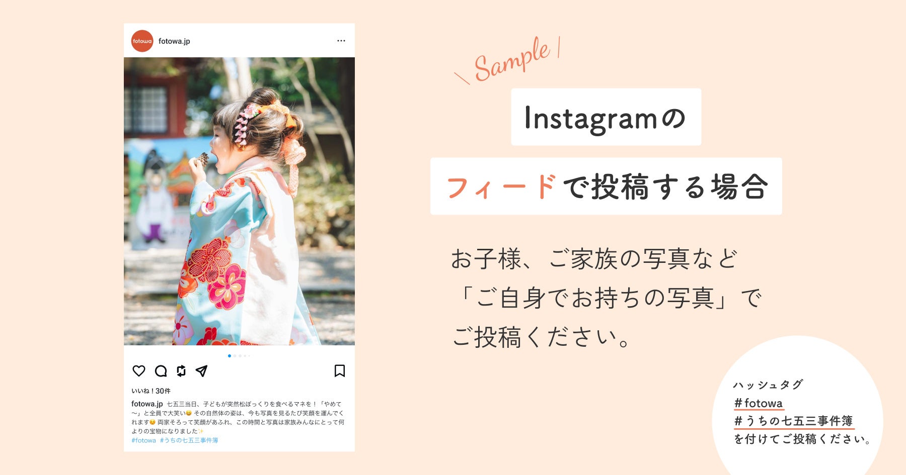 2.ハッシュタグ「#fotowa」「#うちの七五三事件簿」を付けて投稿してください。投稿時にキャプションへエピソードを記入してください!