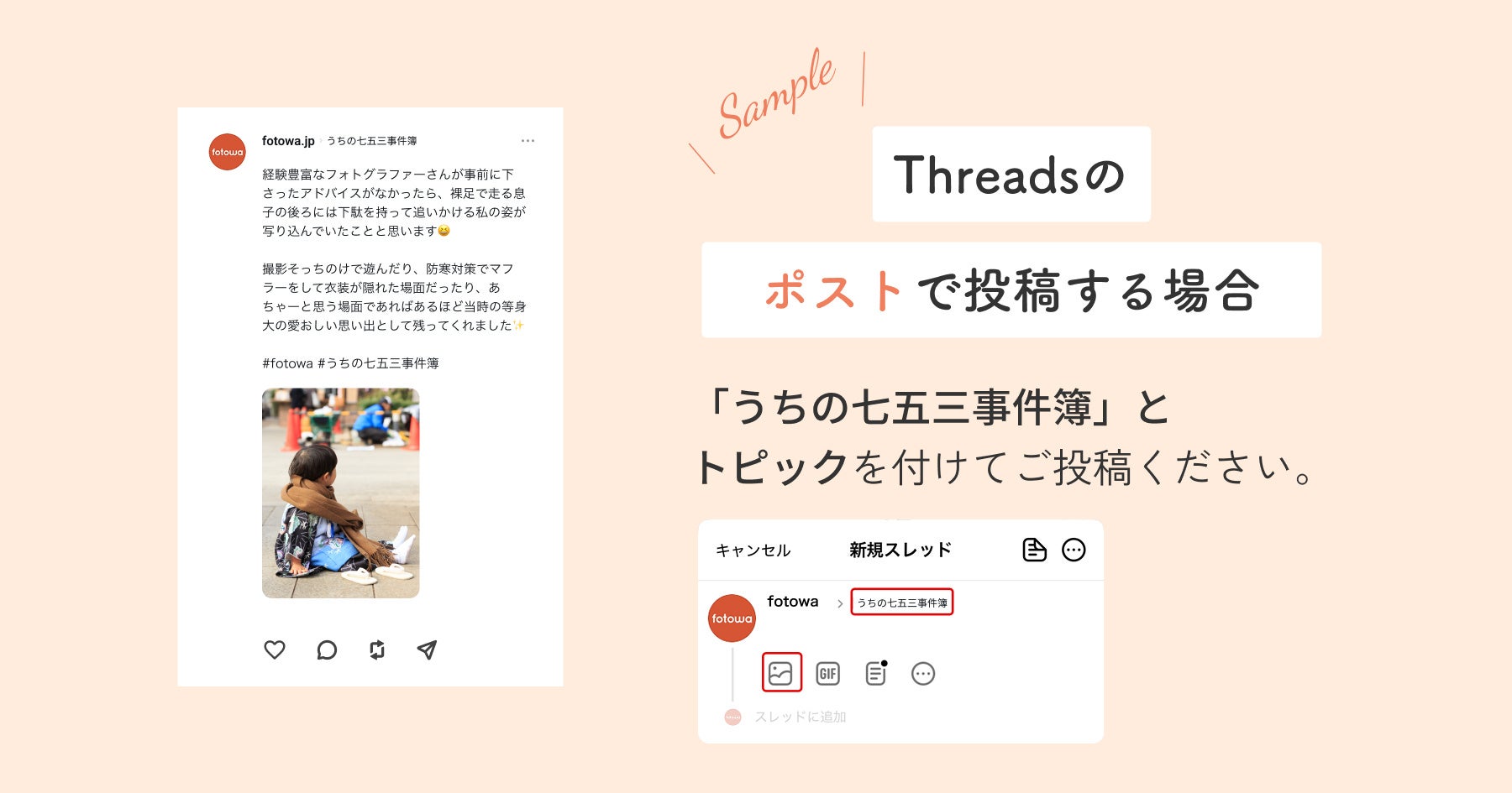 2.「トピックを追加」をクリックし、「#うちの七五三事件簿 」と入力し、写真と一緒にエピソードを投稿してください!※Threadsで付けられるタグは1つだけです。