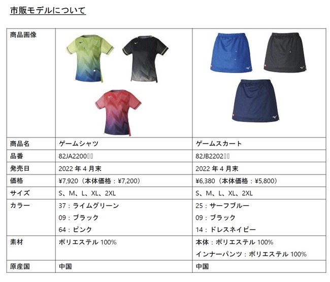 今回の卓球女子日本代表選手着用モデルは全国のミズノ卓球品取扱店、ミズノ公式オンライン等で4月末より発売します。