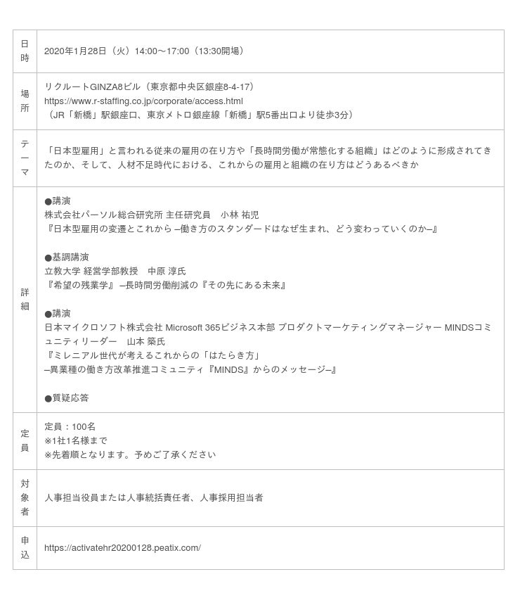 同プロジェクトにて、人事担当者向けイベント「人材不足時代におけるこれからの雇用と組織の在り方とは~日本型雇用と長時間労働を生み出す組織を脱却する~」 を1月28日(火)に開催することをお知らせいたします。新卒一括採用・年功序列・終身雇用・長時間労働などを続けていては、人材採用はおろか人材流出するばかりで企業の成長は見込めません。日本型雇用と長時間労働から脱却するには何をすべきか、そのヒントをお持ち帰りいただきます。