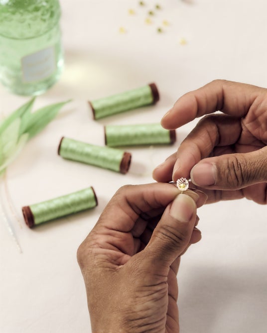 今年は、ゲランとのコラボレーションが実現。1853年にユージェニー皇后とナポレオン三世の婚礼を記念して誕生したゲランの象徴〈ビーボトル〉の装飾を手掛ける栄誉が与えられました。工房では、この象徴的なボトルが春の訪れのために再解釈され、柔らかなグリーンのリボンとスズランのレース刺繍で彩られています。